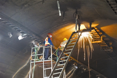 另一處作業(yè)面,負(fù)責(zé)焊接的王師傅拿著器械,正目不轉(zhuǎn)睛地盯著焊接面?!昂附訉燃夹g(shù)要求很高,焊縫還要檢測,得一次成型,否則施工就不合格?!睆氖露嗄觌姾腹さ乃3Q嵬忍?,落下“身疾”,“不過時間久了也就習(xí)慣了,堅持就是勝利。”王師傅依然很樂觀地看待自己的工作。