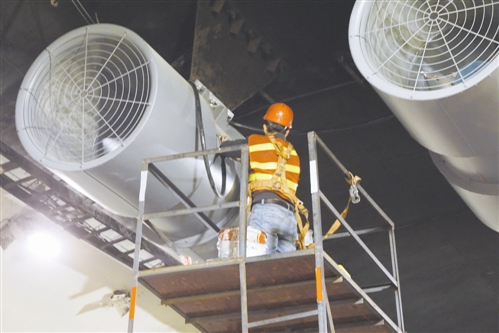 11月1日是隧道整治施工的第四天,工地現(xiàn)場,多個作業(yè)面同時鋪開,施工人員三五個一組共近60來人,有序分工,緊鑼密鼓地開展各項(xiàng)作業(yè)。施工現(xiàn)場,有的站在活動腳手架上安裝燈具,有的在布管線、接線調(diào)試,有的在安裝風(fēng)機(jī)……一項(xiàng)工序銜接著另一項(xiàng)工序,各個工種環(huán)環(huán)相扣。截止當(dāng)晚10點(diǎn)30分,隧道內(nèi)燈具、風(fēng)機(jī)全部安裝完畢,黃土嶺隧道群整治已完成總工程量的60%。