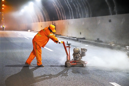 走進(jìn)隧道,一股冷風(fēng)侵襲,洞內(nèi)風(fēng)大又潮。來自湖北的游師傅,負(fù)責(zé)噴隧道墻面乳膠漆。他有著20多年的豐富經(jīng)驗(yàn),在施工現(xiàn)場,他頭戴安全帽,身穿反光背心,緊系安全繩,一個人站在高高的架子上,底下4名工人不時緩緩地推動登高架。游師傅全然不顧洞內(nèi)的濕冷,大手一揮,熟練而均勻地噴灑著油漆,沒多久墻面便嶄新一片。