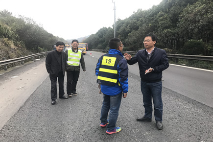 圖為市公路局副局長(zhǎng)童桂正一行在現(xiàn)場(chǎng)指導(dǎo)