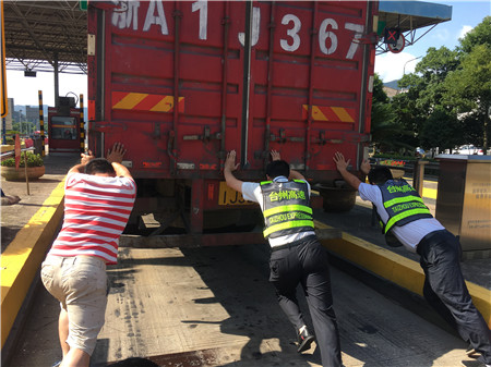 6月19日15時左右,一輛杭州牌照的大貨車,在進入臨海南收費所三車道時突然熄火拋錨,司機嘗試了幾次無法啟動,立刻下車檢查車況。 “師傅,怎么了?有什么能幫您?”收費員徐海源見此情景,立即上前熱心詢問。 “哎!包在油箱口的塑料紙怎么就掉進油箱內(nèi),現(xiàn)在車子怎么都發(fā)不動不了?!彼緳C有點發(fā)急地回答。 “師傅,別著急,我先找?guī)讉€同事幫您把車推出車道?!笔召M員趕緊安慰司機焦急心情。 “好的,那謝謝你們。”司機連忙點著頭。為了避免車道堵車,徐海源立刻利用對講機向當班班長周萍說明情況,周萍立刻關閉該車道,啟動備用車道。此時此刻,收費員李俊杰、楊旭佳毫不猶豫的趕了過來與駕駛員一起推動車子。“一、二、三,一、二、三,使勁呀……”可是車子仍然紋絲不動。怎么辦?請求支援!正準備下班的行政人員陳瑩、劉華萍得知情況后,二話不說飛奔到車道,加入到推車行列中。用力推呀——哎,不行;再來一次——還不行。面對23.97噸的大貨車,大家仍是束手無策?!叭フ腋F棒試試!有道是給你一根鐵棒,我能翹起整個地球。”不知是誰大喊了一聲。“行,可以試試,快去找”話音剛落李俊杰快步跑向所內(nèi),尋找鐵棒。不一會兒,只見他興奮地高舉鐵棒沖著大家喊道:“找到了!找到了!”