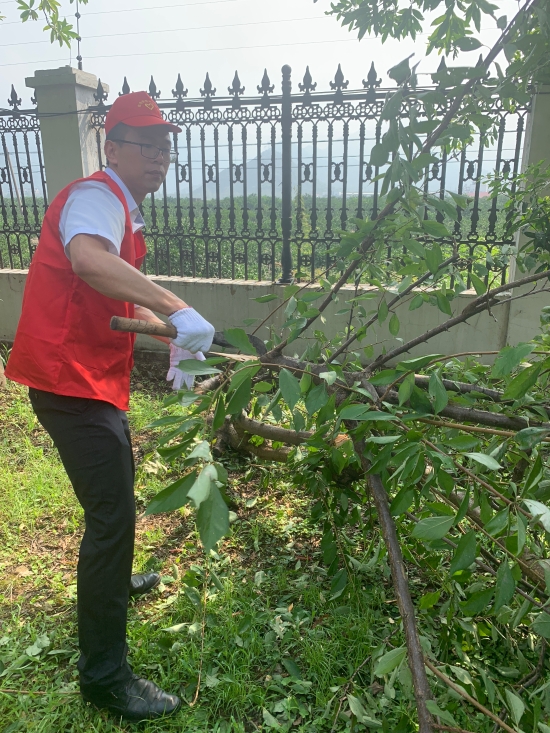 圖為志愿者合影 8月13日上午,該所志愿服務(wù)隊身穿統(tǒng)一紅色馬甲,積極投身到災(zāi)后恢復(fù)工作中。 “把砍刀給我,我力氣大,讓我來。” 活動過程中,孫明偉、杜廣勝、楊堅等同志一行先查看了配電房周邊綠化帶,看到有樹木倒伏,壓在防護網(wǎng)上,存在較大安全隱患,他們二話不說立即手拿砍刀,對樹木進行切割處理,并由李學平、包德福等人安排拉車將斷木等清理干凈。