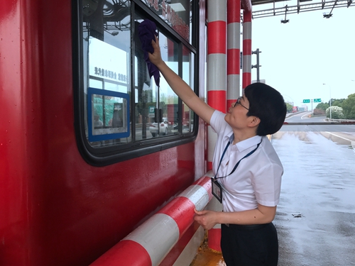 圖為工作人員打掃收費崗?fù)ばl(wèi)生