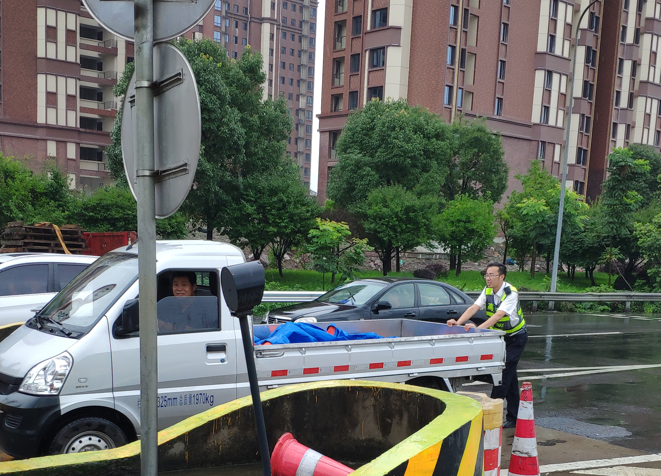 7月4日中午12時30分左右,一輛牌照為浙開頭的五菱小貨車停在臺州收費出口5號車道安全島邊上許久未動,來往車輛紛紛避開該車道。當(dāng)班班長郭斯泓發(fā)現(xiàn)這一情況后立即上前詢問,并在該車后放置隔離桶,提醒駕駛員打開雙閃燈。