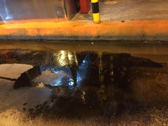 拖車很快到達(dá)車道,經(jīng)初步檢查后確認(rèn)是傳動軸故障,液壓油漏了一地。十分鐘后,車子拖離了車道。由于車子漏的液壓油較多,為避免后來車輛在車道內(nèi)打滑,收費(fèi)員胡德金和施救人員嘗試用水沖,但發(fā)現(xiàn)效果不好,又用洗衣粉沖了一遍確認(rèn)不會滑后再開通車道。沖洗好車道兩人手上的機(jī)油味久久不能去除。