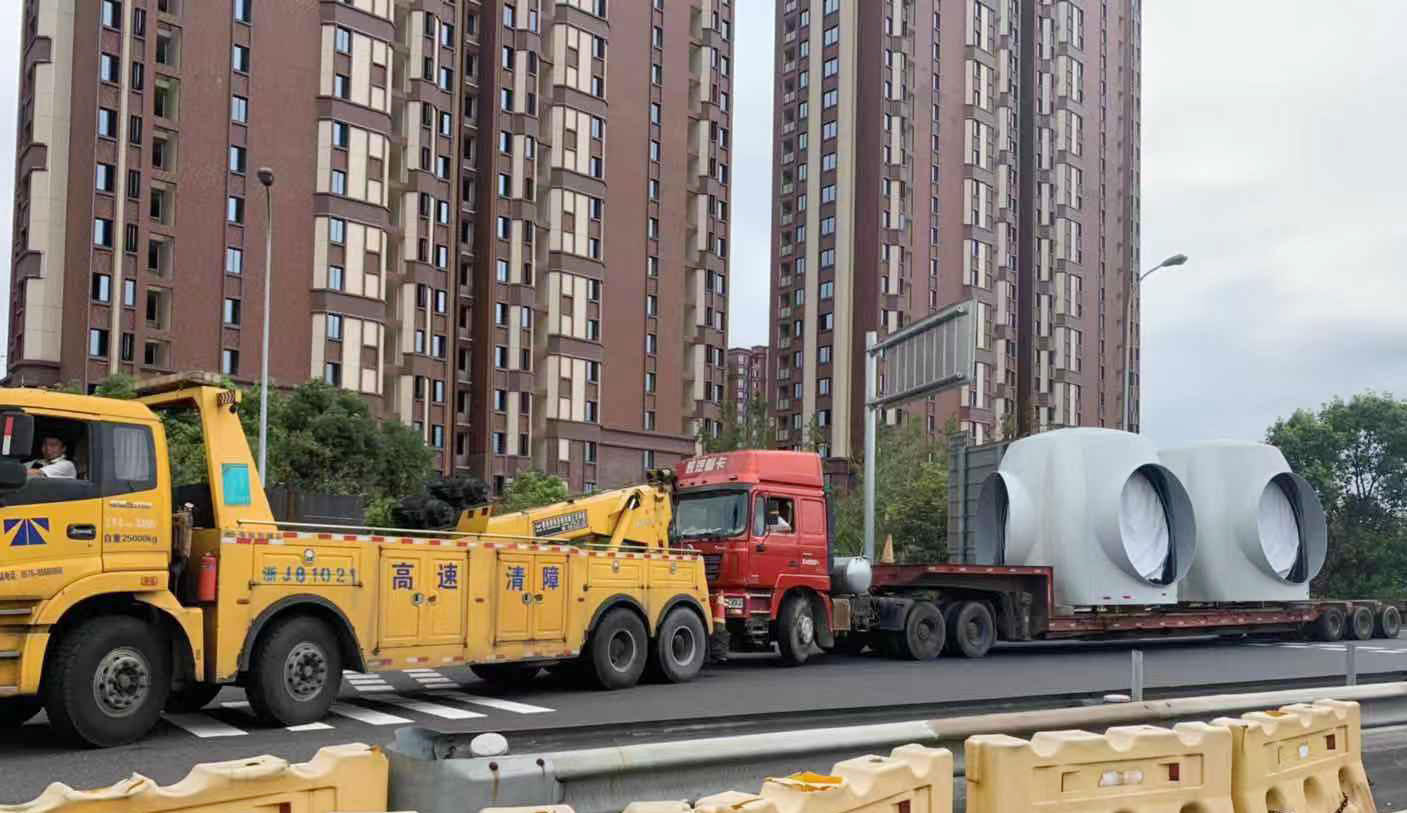 圖為被施救車(chē)拖出的超限車(chē) 接到電話(huà)的第一時(shí)間,當(dāng)班班長(zhǎng)上報(bào)所領(lǐng)導(dǎo),并丈量回復(fù)指揮中心出口超寬車(chē)道寬為4米,進(jìn)口超寬車(chē)道地面寬為4.8米。經(jīng)協(xié)調(diào),超限車(chē)輛從臺(tái)州收費(fèi)所入口車(chē)道下高速。副所長(zhǎng)和班長(zhǎng)隨即拆除內(nèi)廣場(chǎng)的中央隔離帶,以便車(chē)輛可以通行。11:50分,交警攔住寧向出囗車(chē),入口封閉。施救車(chē)拖著該車(chē)緩緩從入口車(chē)道開(kāi)出。 經(jīng)詢(xún)問(wèn)得知,該車(chē)辦理了超限運(yùn)輸車(chē)輛通行證,運(yùn)載大型輪轂從樂(lè)清上高速去內(nèi)蒙,結(jié)果行駛至臺(tái)州時(shí),車(chē)子出了故障。該車(chē)車(chē)重84噸,原本需要繳納通行費(fèi)695元,大件運(yùn)輸優(yōu)惠后僅需繳納395元。雖然車(chē)子壞了,但駕駛員依然向工作人員表示感謝,并感言合法裝載的好處,不然還要面臨處罰。入口封閉大概二十分鐘后,車(chē)道恢復(fù)通行。
