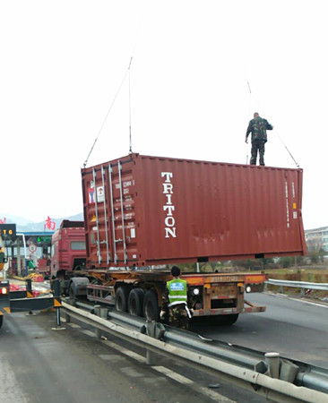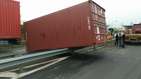 12月15日10:10分左右,一輛車牌為浙B88C06的集裝箱車在臺州南副站選擇出口車道時(shí),因變道和出口運(yùn)載汽車的長掛車發(fā)生碰撞,使得未鎖牢的集裝箱箱體甩落下來,砸到護(hù)欄及進(jìn)口一輛正在通行的貨車車頭,造成護(hù)欄變形、貨車車頭受損嚴(yán)重,所幸無人員受傷。