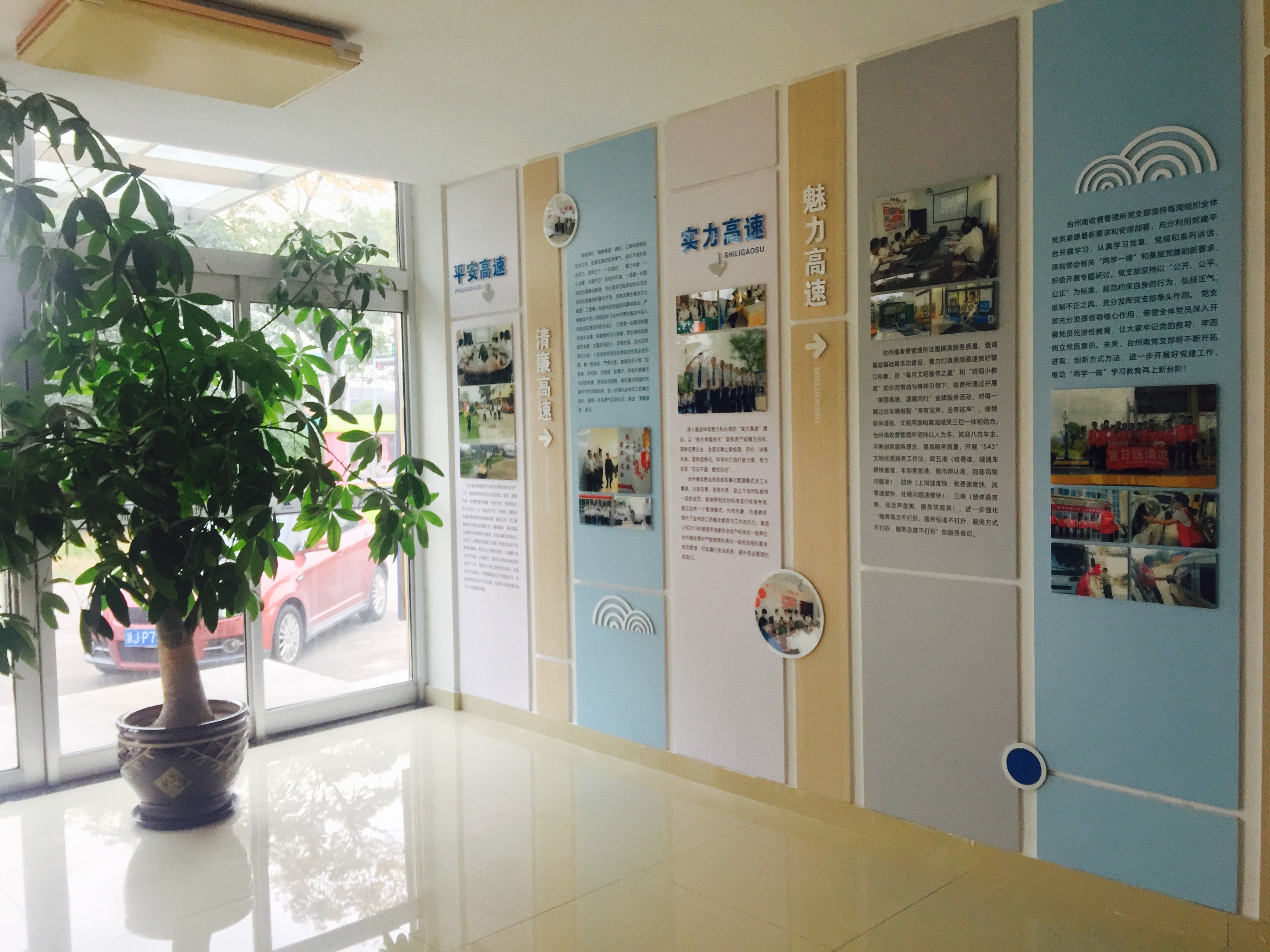 近日,臺州南收費所的門廳悄然換上了新裝,兩面設(shè)計新穎別致圖文并茂的介紹版取代了原先略顯陳舊的介紹版,成了踏進所內(nèi)迎面而來的點睛之作。這“舊貌煥新顏”的背后,正是所內(nèi)黨員自發(fā)組織積極參與的行動力。