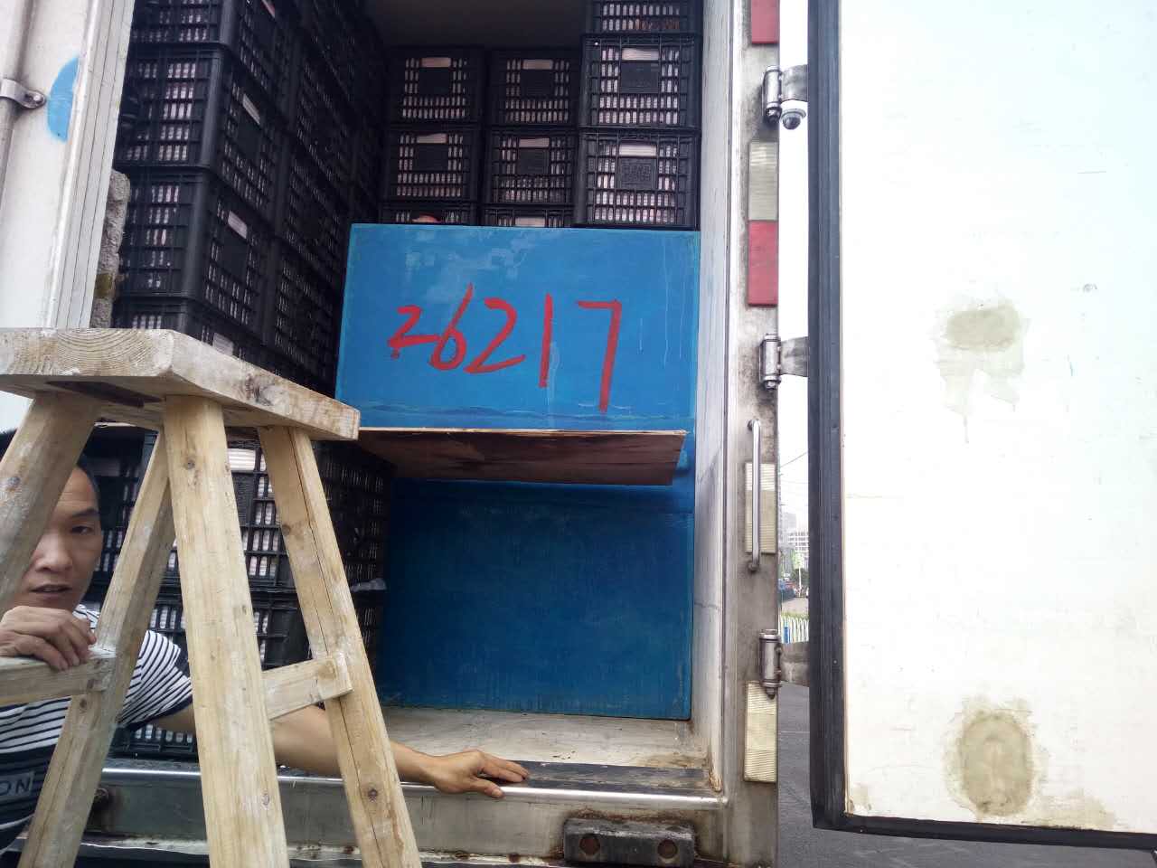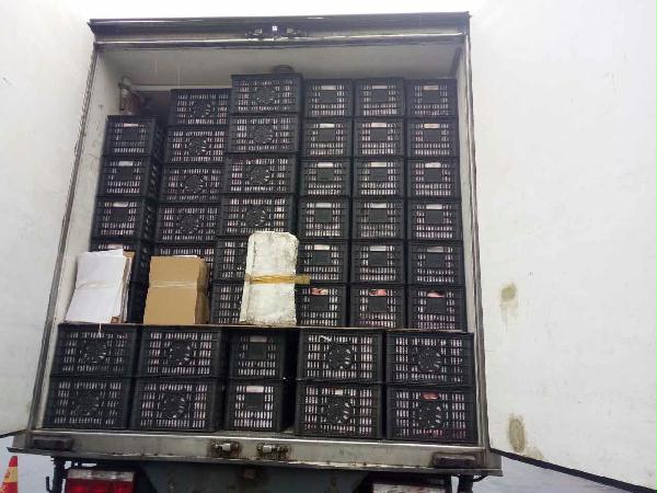 圖為被處罰的車輛 早上10點40分左右,這輛運(yùn)蘋果的貨車駛?cè)胧召M站的一號崗?fù)?,司機(jī)師傅說自己運(yùn)的是蘋果,根據(jù)公司規(guī)定,綠農(nóng)車檢查必須開車門檢查貨物。憑著多年的檢查經(jīng)驗,當(dāng)班班長童軍偉發(fā)現(xiàn)這輛綠農(nóng)車有問題,覺得重量遠(yuǎn)遠(yuǎn)不夠,可能不符合“綠農(nóng)”免費政策。果不其然,車廂中“深藏玄機(jī)”,左右兩側(cè)各有一排玻璃鋼魚箱,這就給檢查增加了難度。當(dāng)班班長要求司機(jī)師傅把最后兩排箱子拿掉,想檢查玻璃魚缸,然而這個司機(jī)極其不配合,還惡意刁難工作人員,說什么也不搬蘋果。