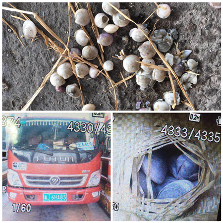 該車被篷布包著,車上貨物又被袋子緊緊包著。當(dāng)工作人員要求檢查取證時(shí),駕駛員只摳開指定的袋子,并且口子開得非常小,只讓人隱約看到貨物是貝殼。工作人員按規(guī)定要求駕駛員打開另一處取證,駕駛員以貨物被繩子綁著不好打開為由,只在前端把袋子摳了一個(gè)比硬幣大點(diǎn)的小洞,拿出幾個(gè)貝殼,工作人員看到其拿出的貝殼不管是在大小還是顏色上,都和他剛才指定的那袋貨物有明顯區(qū)別,于是工作人員親自用手摸進(jìn)去查驗(yàn),經(jīng)仔細(xì)檢查,貨物屬于貝殼中的殘次品,懷疑是飼料用途。
