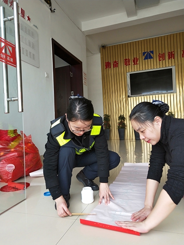 圖為工作人員為營造春節(jié)氣氛分工合作 此外,大家在收費所宿舍區(qū)、辦公樓、收費區(qū)域等地方貼“?!弊?、貼對聯(lián)、掛燈籠、插彩旗,以大紅或金黃色為主色調(diào),充分烘托出收費所“祥和、喜慶、歡快”的節(jié)日氛圍。