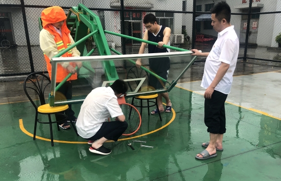 此前,溫嶺西已經(jīng)做好基礎(chǔ)的抗臺防范工作,關(guān)閉所內(nèi)各寢室、辦公室門窗,提前裝好沙袋備用,準(zhǔn)備好抗臺物資及近幾天的餐食,確保所內(nèi)各項事務(wù)正常運行。8月9日上午,該所長、副所長在臺風(fēng)前做最后一次細(xì)致的排查,三人還親自動手將陽光房的窗戶都卸下來,避免風(fēng)力太大,玻璃破裂,造成安全隱患。此外,為預(yù)防操場籃球架承受不住巨大風(fēng)力,將籃球框拆卸下來,把籃球架放倒。其后通知所內(nèi)開車的人員將所有車輛停入操場中,以防止周邊樹木被風(fēng)刮斷,造成車輛損失。