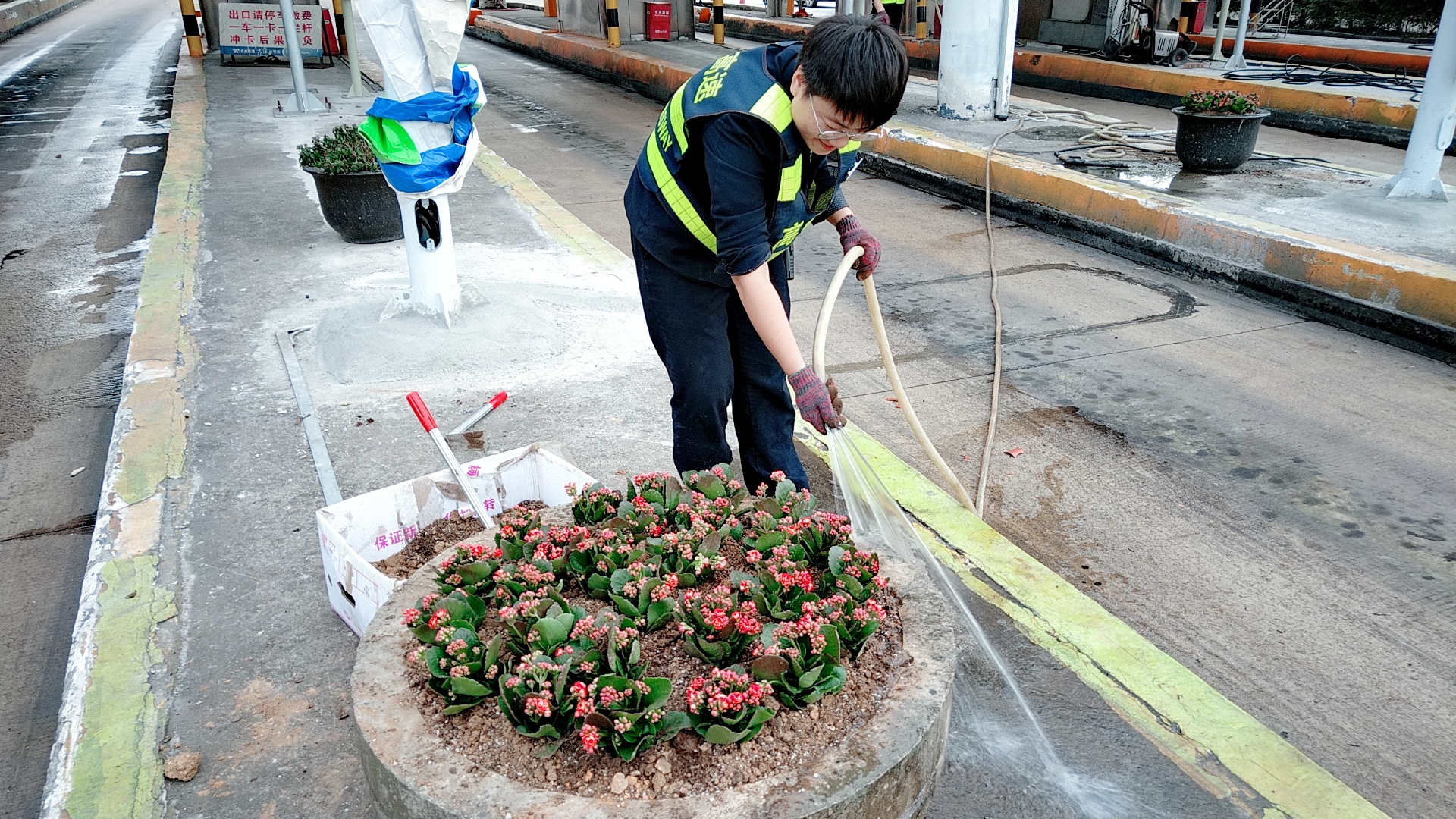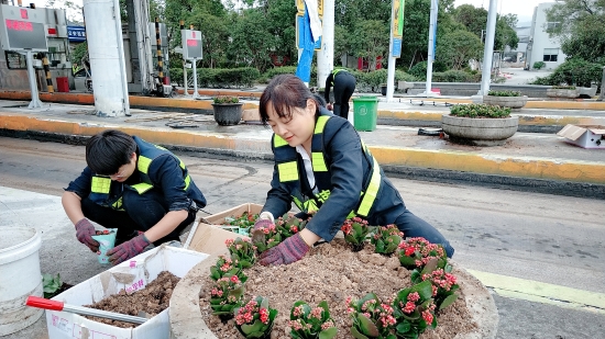 現(xiàn)場(chǎng),志愿者們身穿反光背心,拿著鋤頭、鐵鍬、水桶,帶著事先買來(lái)的小花苗,來(lái)到收費(fèi)區(qū)域的島頭開始栽花活動(dòng)。所領(lǐng)導(dǎo)班子成員身體力行,帶領(lǐng)大家投入到緊張的勞動(dòng)中。大家挽起衣袖,不怕臟、不怕累,有的松土、有的種花、有的填土,有的澆水……有序地將一棵棵花苗栽進(jìn)土壤。