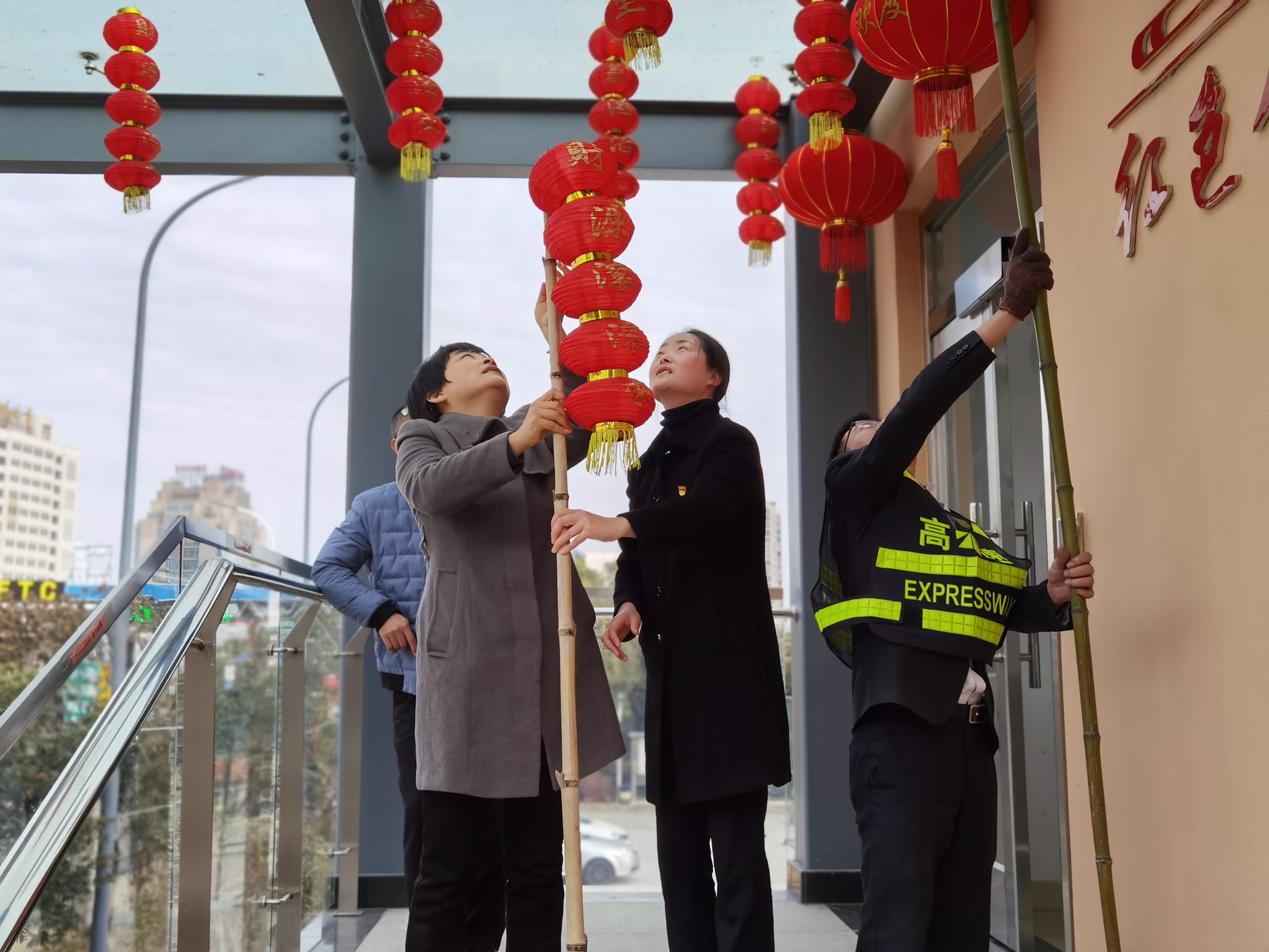 大家分工合作,搬梯子、遞春聯(lián)、貼膠帶、校正高低在站所內(nèi)每個(gè)角落都掛上了紅彤彤的燈籠;收費(fèi)區(qū)域內(nèi)廣場(chǎng)兩邊的欄桿上扎著一面面彩旗。一幅幅精致喜慶的對(duì)聯(lián)、“?!弊郑淮遣势?,一個(gè)個(gè)大紅燈籠把整個(gè)收費(fèi)站所點(diǎn)綴得處處洋溢著濃厚的節(jié)日氛圍,“年味”十足,讓在站員工和過(guò)往司乘朋友感受到新年的喜慶氛圍和“家”的溫暖