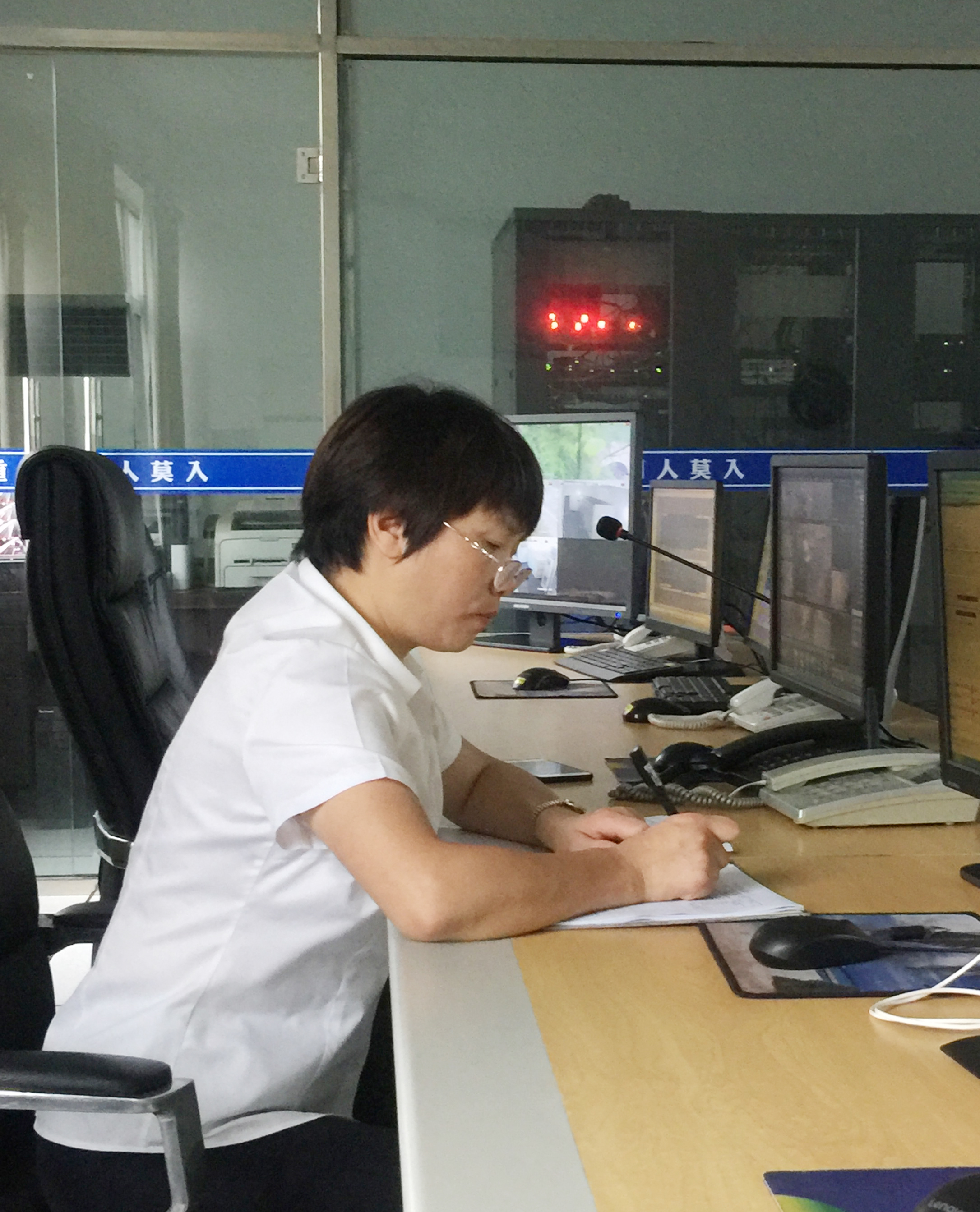 開朗樂觀,善于團結(jié)同事,幾乎是班隊“組織部隊”擔當?shù)?/span>“開心果”,她就三隊中控員金素彬。別看她平時嘻嘻哈哈大大咧咧,工作起來一板一眼,來不得半點馬虎。接班上崗時,只見她一手拿筆,架起老花鏡,認真做好中控交接班記錄,仔細檢查監(jiān)視設備運轉(zhuǎn)情況,確保中控設備都正常運行。中控室內(nèi),幀幀銀屏,一覽車流,幅幅畫面,縱觀隧道南北動向。7月6日下午4點47分,金素彬敏銳地發(fā)現(xiàn)一輛集裝箱拋錨在寧向隧道停車帶,一半身掛在主車道上,車流如織呼嘯過,情況十分危險。于是鏡頭切換、廣播呼叫電話通報、更改信號燈、情報板、追蹤記錄……一切操作有條不紊、井然有序,如同久經(jīng)沙場的指揮官。就這樣,她又一次通過熒屏和電話,排除安全隱患,保證了隧道的暢通。面對進入倒計時退休日子,她感慨千萬:“十幾年的中控工作還真是舍不得,如果公司需要,我會義不容辭留下為公司發(fā)展作貢獻。