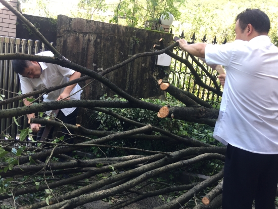 圖為臺(tái)風(fēng)過(guò)后隧道所人員給倒伏的樹木截枝