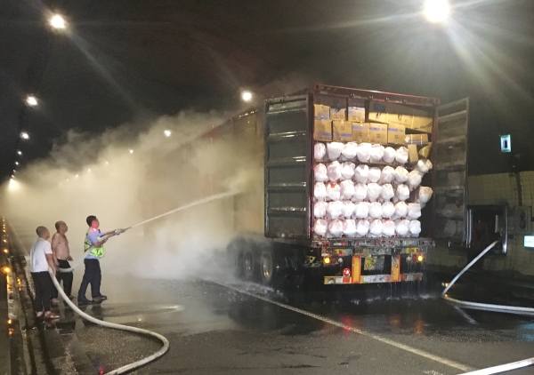 萬(wàn)幸的是,恰逢溫州高速交警巡邏車(chē)經(jīng)過(guò),隨即在該貨車(chē)后方預(yù)警,很快的所巡邏車(chē)、消防車(chē)先后到達(dá)現(xiàn)場(chǎng)協(xié)同滅火。由于該車(chē)貨物較多,且裝載物皆為紙箱和塑料,集裝箱底層溫度較高,一時(shí)只能將明火撲滅,但車(chē)廂內(nèi)仍有大量煙霧,為了安全,車(chē)子必須盡快撤離隧道,執(zhí)勤隊(duì)當(dāng)即決定讓駕駛員把車(chē)開(kāi)往南廣場(chǎng)繼續(xù)滅火,消防車(chē)則一路緊隨其后滅火,以防火勢(shì)變大。