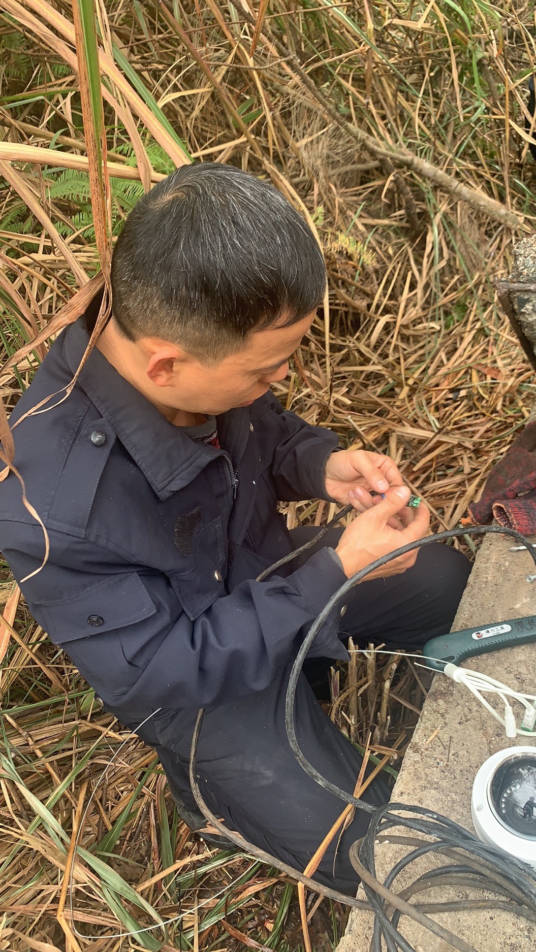 大溪嶺南高位水池地點在溫州地界,山體較高,攀行需要近一個小時,金所得知情況后,立即帶著執(zhí)勤隊上山到高位水池檢查,他們背著工具箱,戴著手套、拿著柴刀,經過一個小時的披荊斬棘來到南高位水池的井口,金所爬到井里進行檢查,發(fā)現光纜和電線都被老鼠咬斷了,才導致圖像不能工作,當場把電線接了回去,并回所準備其他材料,明日再次登山修理。