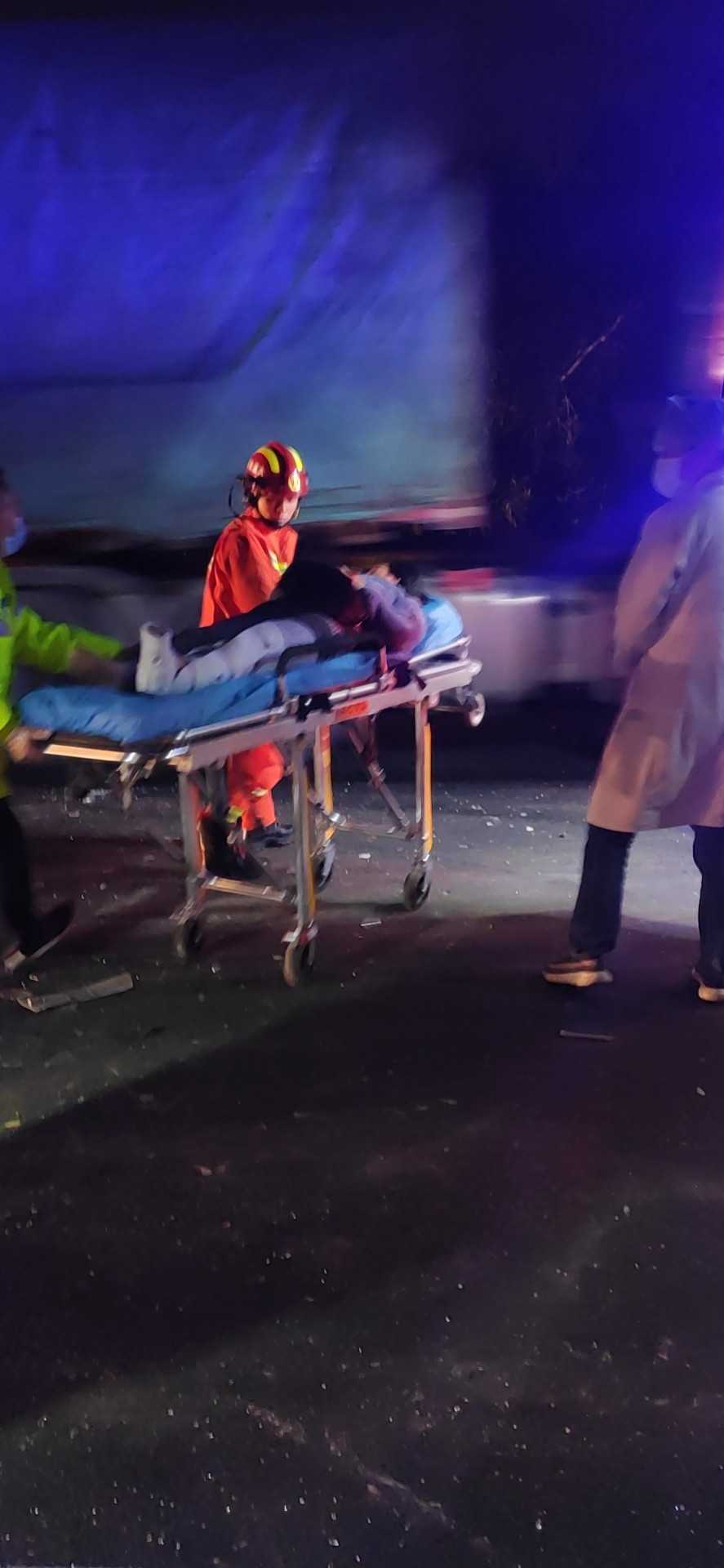 22:00第一輛救護車到達。醫(yī)護人員準備擔架,另一名醫(yī)生去詢問坐在地上的受傷人員,由于車頭嚴重變形,司機與鄰座的人都被卡在駕駛室,經(jīng)過消防員的救援,受傷最嚴重的司機首先被救了下來,在被救下的那刻暈了過去,醫(yī)護人員立該把傷員抬上救護車,緊接著消防員救下第二位被卡傷員,第二輛救護車帶著傷員離開,最后一輛救護車卻遲遲沒到,經(jīng)聯(lián)系監(jiān)控中心后得知救護車已上高速,但因后方車輛太多,救護車和拖車都被堵了,經(jīng)和臺州高速交警協(xié)商后,最后清理一個車道讓救護車和拖車先開上來,巡邏車去事故車后方預警,22:30救護車帶走最后一名傷員,事故車被拖走,路面恢復正常通車。