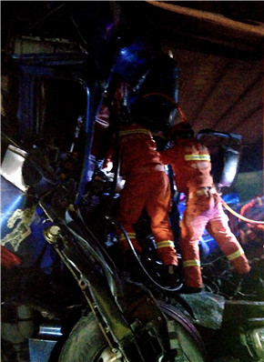 5分鐘后,兩輛紅藍警燈閃爍的施救車迅速飛至現(xiàn)場。此時現(xiàn)場多車損毀嚴重,尤其最后一輛大貨車駕駛室嚴重變形,司機受傷,胸部以下被車頭卡住無法動彈,血水從門縫流出,現(xiàn)有設(shè)備無法有效救援,也無法知道有無生命危險。