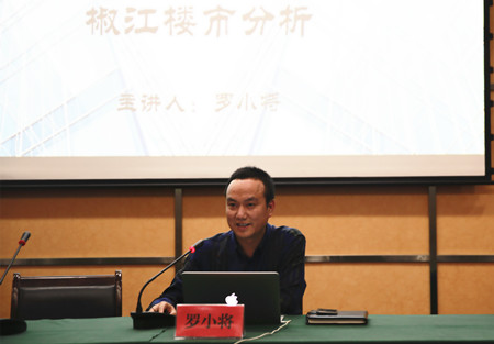 圖為集團(tuán)黨委委員、副總經(jīng)理羅小將分析椒江2017年樓市情況