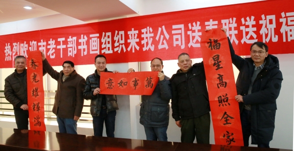 市老年書畫研究會(huì)會(huì)長(zhǎng)楊通河一行來公司送春聯(lián)送祝福 1月17日下午,市老年書畫研究會(huì)會(huì)長(zhǎng)楊通河,市直機(jī)關(guān)老干部書畫協(xié)會(huì)領(lǐng)導(dǎo)施巨日、陳孔梅一行來公司送春聯(lián)送祝福,感謝公司對(duì)研究會(huì)的支持和關(guān)愛,祝愿公司在新的一年里紅紅火火,萬事如意,經(jīng)營發(fā)展越來越好。
