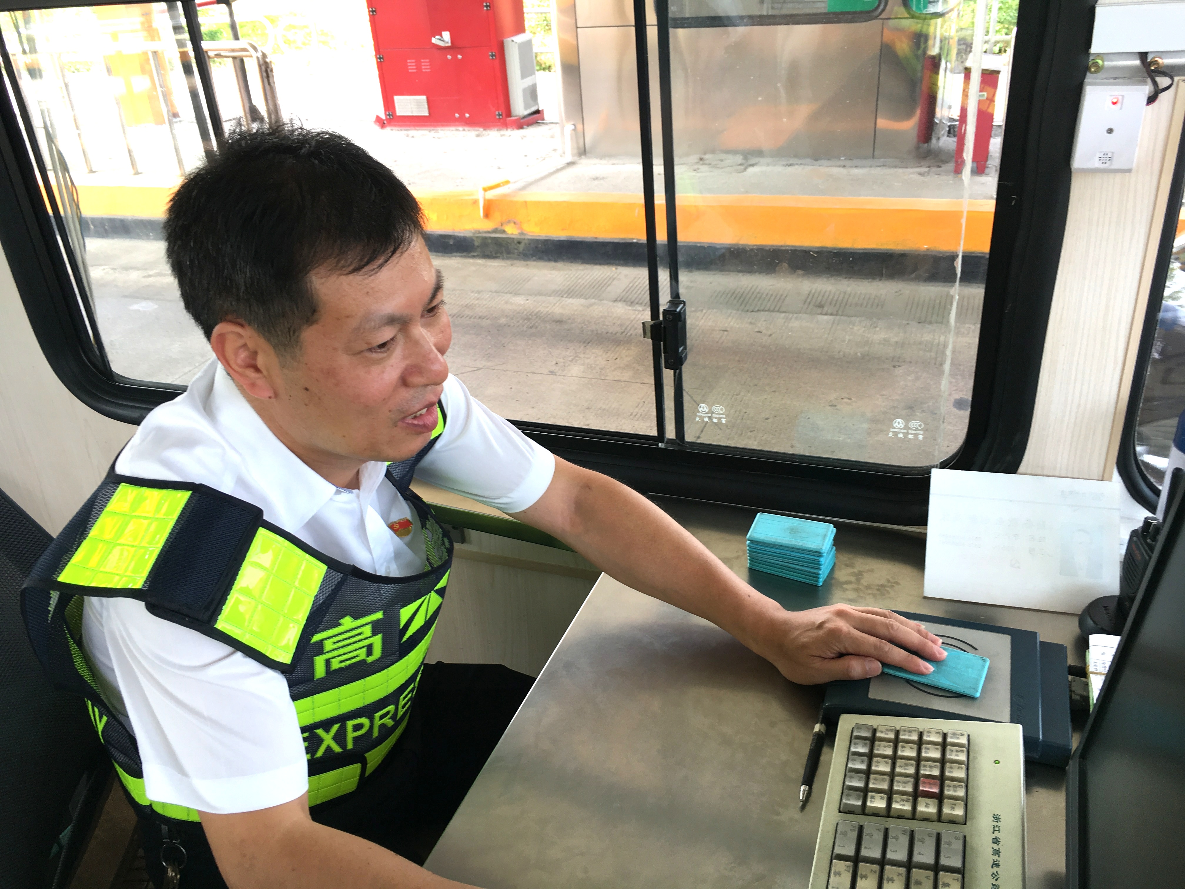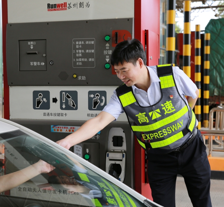 而在對面發(fā)卡的安全總監(jiān)項同富正襟危坐,等待著車子的駛?cè)耄?/span>“記住動作就忘記微笑,笑起來又忘記要說什么......真有點手忙腳亂的,做好收費員,不容易?!?/span>