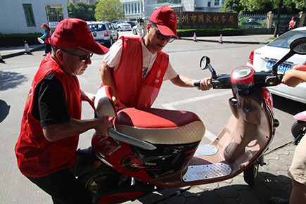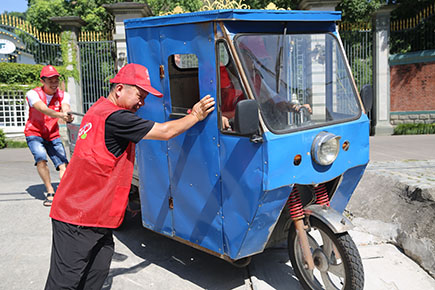 上圖為志愿者服務隊合力推離停放不規(guī)范的電瓶車、三輪車