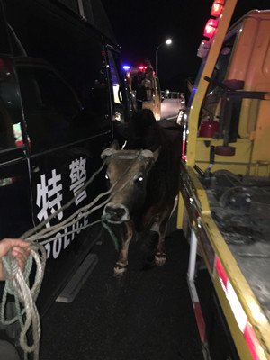警報(bào)拉起,警燈閃爍,猛牛在施救車和巡邏車護(hù)送下,走過(guò)黃土嶺隧道,并在警車引導(dǎo)下,走向臺(tái)州收費(fèi)所出口。晚7:00時(shí)在即將出口時(shí),牛開(kāi)始受驚,四處突圍,為避免事故,飛速趕過(guò)來(lái)的臺(tái)州110特警擊中了牛蹄,制伏了開(kāi)始發(fā)瘋的牛。費(fèi)了老大力氣,特警、交警及施救人員總算合力將牛抬上施救車安全帶下了高速公路 。
