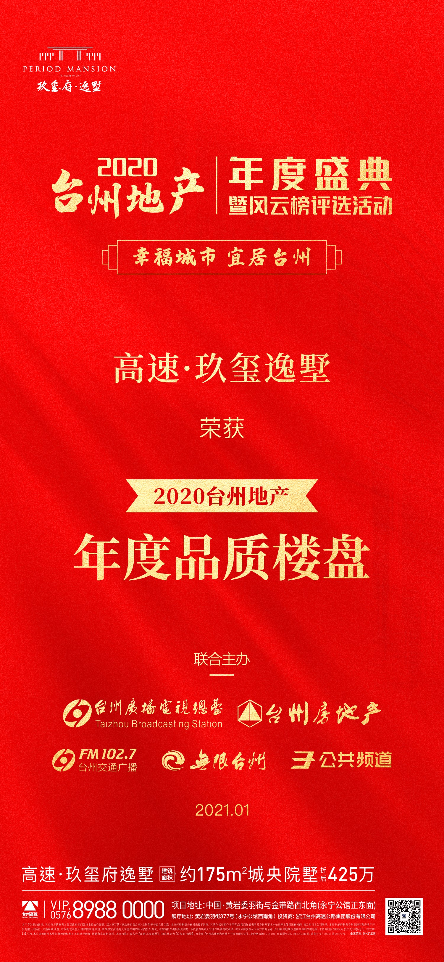 2021年1月19日下午,由臺(tái)州廣播電影電視集團(tuán)聯(lián)合臺(tái)州市房地產(chǎn)業(yè)協(xié)會(huì)共同舉辦的2020臺(tái)州地產(chǎn)年度盛典暨臺(tái)州地產(chǎn)風(fēng)云榜,在全城熱矚下重磅舉行。高速房產(chǎn)玖璽府·逸墅項(xiàng)目榮獲“2020臺(tái)州地產(chǎn)年度品質(zhì)樓盤(pán)”榮譽(yù)稱(chēng)號(hào)。