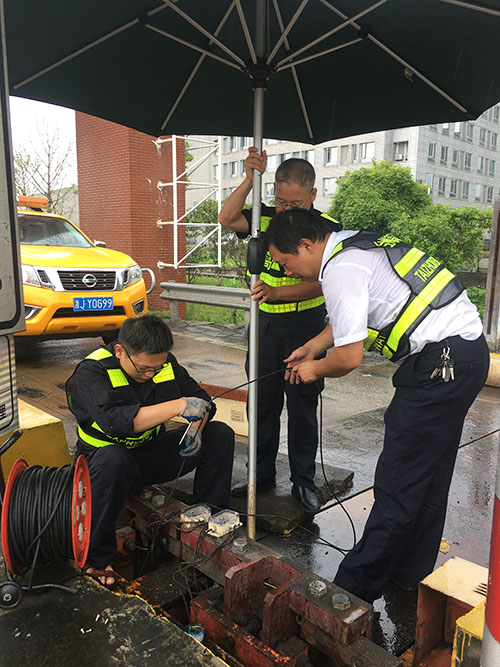 可是天公不作美,經(jīng)過一夜,雨還持續(xù)飄落著,收費站出口車輛逐漸增多,再不檢修將會導致其他車道通行壓力越來越大,可是如果冒雨檢修則有損壞設備的風險。正在兩難之際,中心負責人葉俊向兄弟單位借來了一頂大型遮陽傘,在大傘遮擋下,搶修小組不顧前晚疲憊,對稱臺的4組傳感器用萬用表進行了一一檢測,結果顯示也全部正常。 “可為何組合起來傳輸?shù)教幚砥魃系臅r候計重數(shù)據(jù)就不正常了呢,難道問題出在這根數(shù)據(jù)線上?”順著這個思路,搶修人員慢慢地將這根線從線井中拉出,果不其然,在線的中間位置發(fā)現(xiàn)了被老鼠咬破的裂痕。為使數(shù)據(jù)傳輸更加穩(wěn)定可靠,搶修人員采用了整體更換方式,重新穿線再將兩頭的接點用電烙鐵進行焊接,經(jīng)過一個多小時地奮力搶修,稱臺故障終于排除,該車道也恢復正常通行。此時,搶修人員后背濕透,分不清是汗水還是雨水……