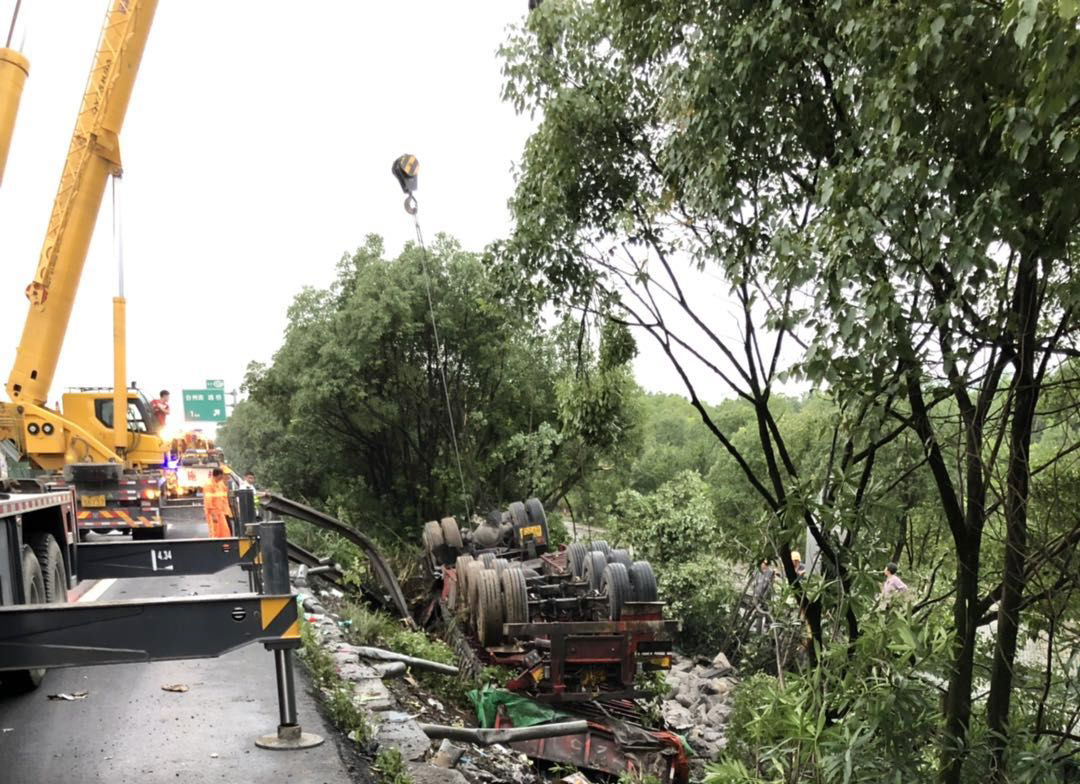 7月14日凌晨1點,溫州方臺州南收費所附近,一輛半掛型大貨車和一輛快遞車相撞,半掛車直接沖出高速,四腳朝天??爝f車則是被巨大的沖擊力撞向了硬路肩,側(cè)翻中撒下數(shù)十米的貨物。1點10分,救援車輛到達現(xiàn)場,現(xiàn)場一片狼藉,防撞護欄板、護欄柱損傷嚴(yán)重,橋梁鋼管都折斷了不少。