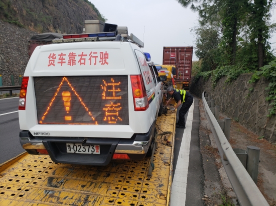 巧合的是,當(dāng)天下午四點(diǎn),這里曾在救援中幫助過(guò)施救中心的警車因?yàn)檩喬ス收希黄韧T趯幭螯S土嶺外的緊急停車帶上,又是兩人將該車平安救下高速。
