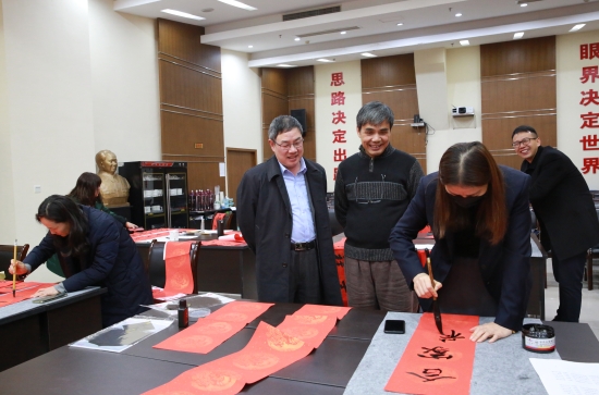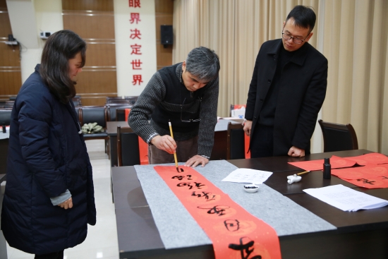 臺州高速集團開展“寫春聯(lián)、送祝?!被顒?/span> 春節(jié)將至,臺州高速集團開展以“迎新春、送祝?!睘橹黝}的寫春聯(lián)、送春聯(lián)活動,并邀請書法老師到場指導。來自集團各部室、所、子公司的書法愛好者紛紛前來參與,集團董事長、總經(jīng)理陳文波到場觀摩。
