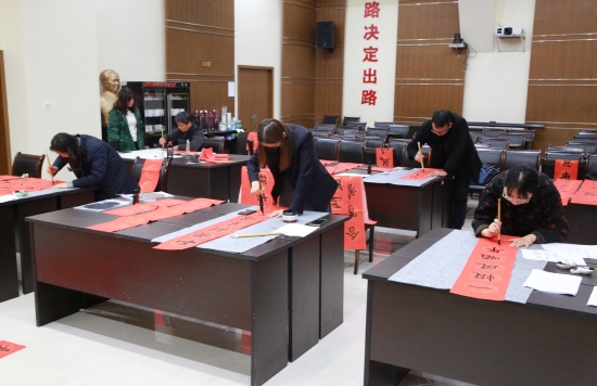 圖為學員學習寫書法 本次活動由集團辦公室牽頭組織,以集中書寫和分開書寫相結合的方式進行。參與者在百忙之中抽出自己的業(yè)余時間,積極參與到活動中來,共同書寫500多幅春聯(lián)作品。春節(jié)臨近,集團全體員工和集團兩個結對村的100戶村民都將收到暖暖的“送春聯(lián)”祝福。 當日集中書寫現(xiàn)場,參與者們認真埋頭書寫,并不時地相互請教學習。有的下筆蒼勁有力、筆精墨妙,有的如行云流水一筆而下,有的力透紙背,一個個大字很快躍然紙上。