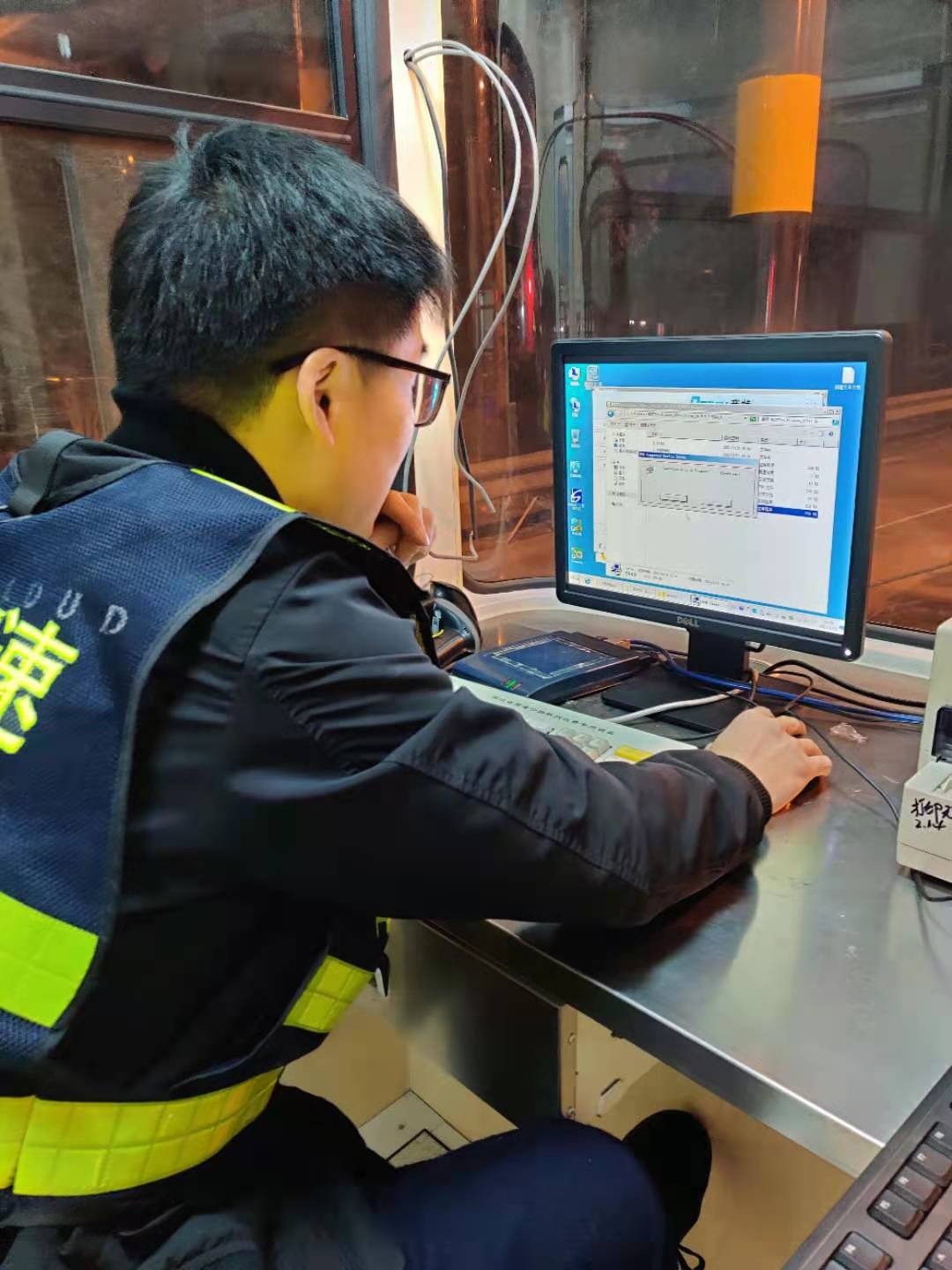 22日一早,中心電工配合廠家人員在車道繼續(xù)查線、接線,安裝崗?fù)さ幕A(chǔ)設(shè)備,系統(tǒng)員則在機(jī)房負(fù)責(zé)安裝新電腦的收費(fèi)系統(tǒng)及相關(guān)設(shè)備驅(qū)動。大家各司其職、各盡其責(zé),僅一天時間就將近百根線纜一一對應(yīng)并成功與外圍設(shè)備對接,與此同時,系統(tǒng)員也恢復(fù)了原電腦中的數(shù)據(jù)并成功導(dǎo)入到新電腦中,避免了數(shù)據(jù)中斷。在修復(fù)過程中,搶修人員也曾遭遇各種困難,有些設(shè)備安裝需要專用工具,部分零散配件、電源等一般商鋪都沒有供應(yīng),但這些并沒有難倒他們,而是利用各自資源,跑遍了市區(qū)的大街小巷,或借或買,最后都被一一解決。