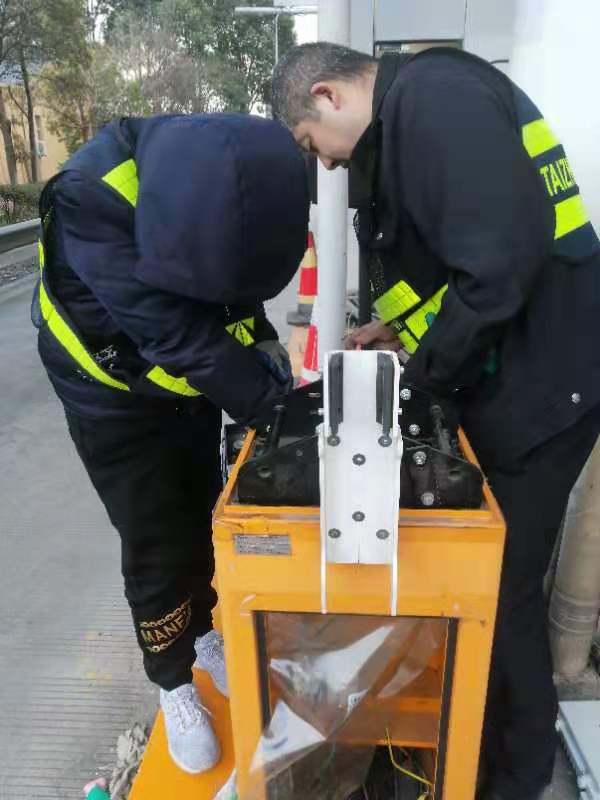 (圖為搶修人員在調(diào)試欄桿機(jī)設(shè)備)