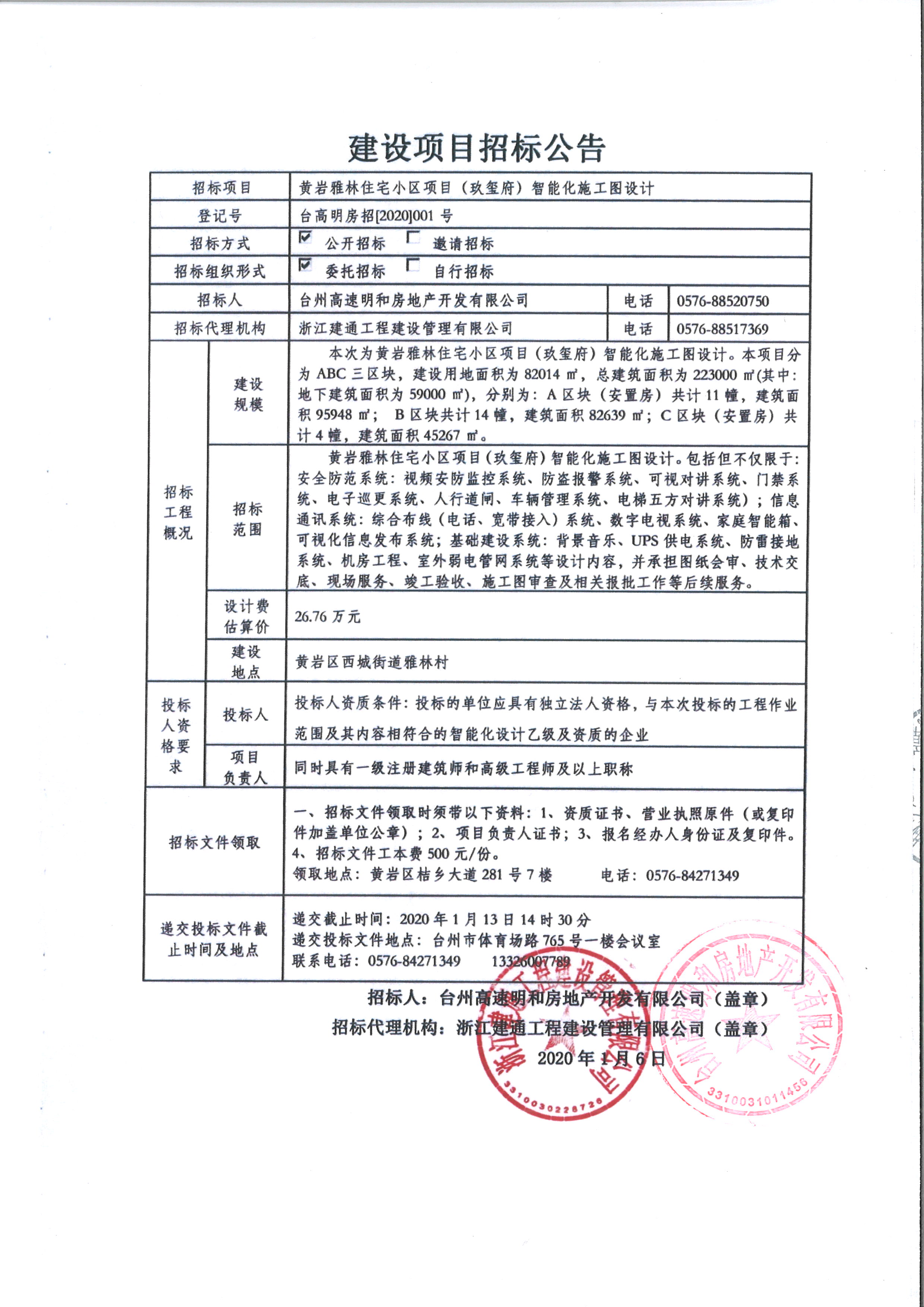黃巖雅林住宅小區(qū)項(xiàng)目(玖璽府)智能化施工圖設(shè)計招標(biāo)公告