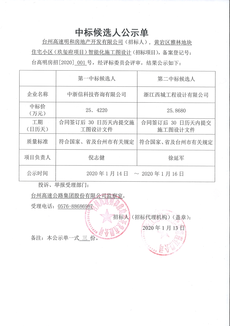 黃巖區(qū)雅林地塊住宅小區(qū)(玖璽府項目)智能化施工圖設(shè)計中標候選人公示單