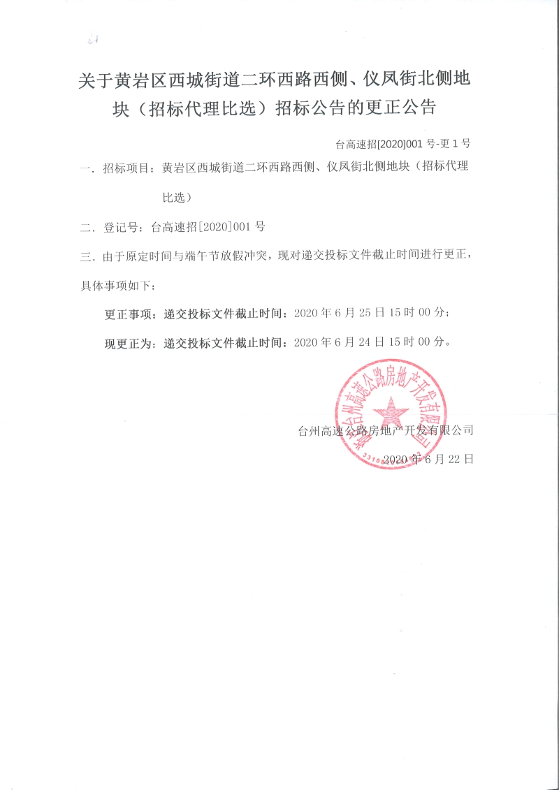 關(guān)于黃巖區(qū)西城街道二環(huán)西路西側(cè)、儀鳳街北側(cè)地塊(招標(biāo)代理比選)招標(biāo)公告的更正公告