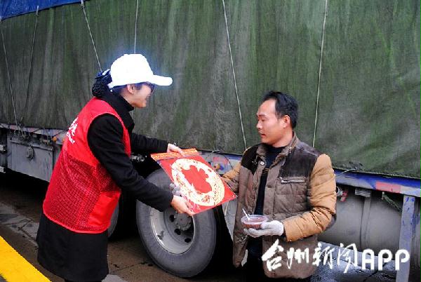 圖為志愿者為司機(jī)送上“?!弊帧`嶇z