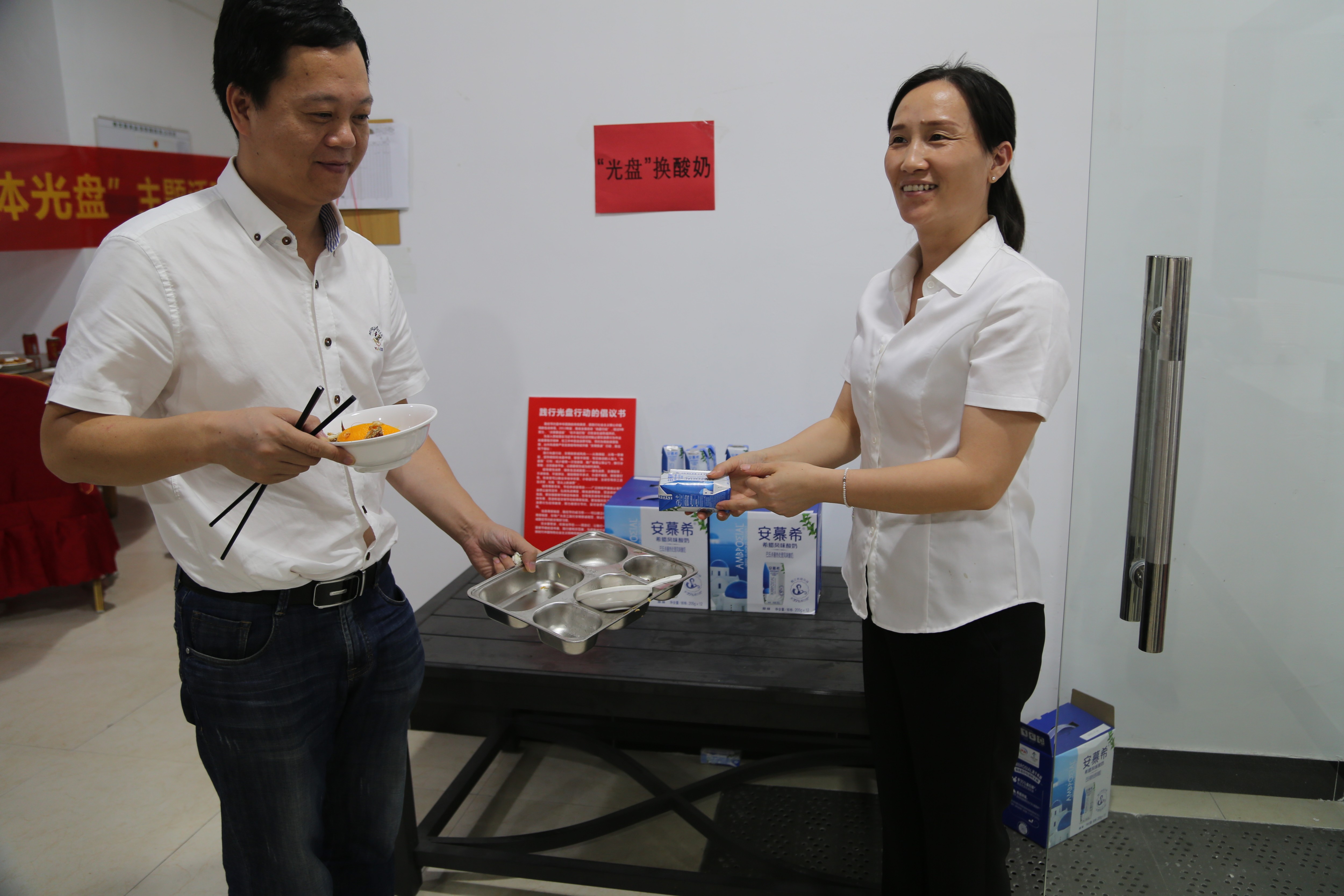 餐后,公司為倡導(dǎo)員工愛惜糧食,鼓勵員工積極光盤,實行“光盤獎勵”,每一位員工憑光盤可以兌換酸奶一瓶,借此小獎勵,倡導(dǎo)文明新風(fēng)尚,以“光盤”為榮,以“剩宴”為恥。 盧丹麗